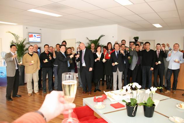 新大陸電腦股份公司董事長胡鋼先生、德國HCJ.董事長Thomas Jauch先生、股份公司總經(jīng)理孫亞力、北美公司總經(jīng)理Chrise、股份公司技術(shù)研發(fā)中心總監(jiān)林建華,荷蘭Digital公司董事長Peter H. Sliedrecht先生 (新大陸歐洲公司首席執(zhí)行官)、歐洲公司財務(wù)總監(jiān)Patrik先生,歐洲公司市場總監(jiān)Rene先生等人在開業(yè)典禮前,進(jìn)行了座談,之后在Peter先生的主持下,與Digital公司公司全體員工一道,參加了新大陸歐洲公司的開業(yè)典禮。