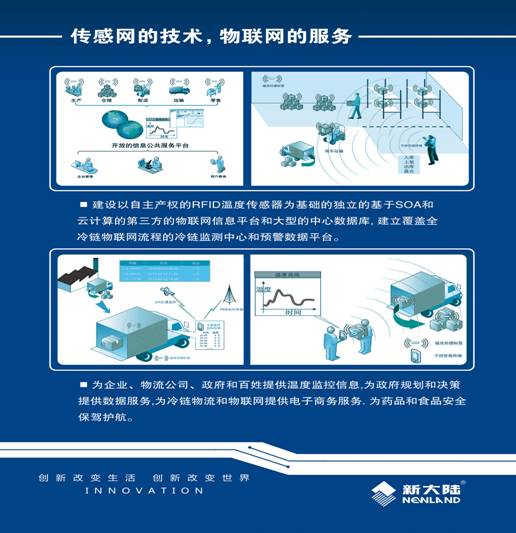 這是目前全球最領先的將RFID和傳感網技術,移動技術,物聯網技術結合的技術,也是目前世界冷鏈物流管理不可缺少的核心技術,而公司建立的基于自主產權的冷鏈物聯網公共信息可視化服務平臺更是冷鏈物流的創新, 將極大的改變我國冷鏈物流管理手段落后的局面,并將領先全球冷鏈物流管理水平。